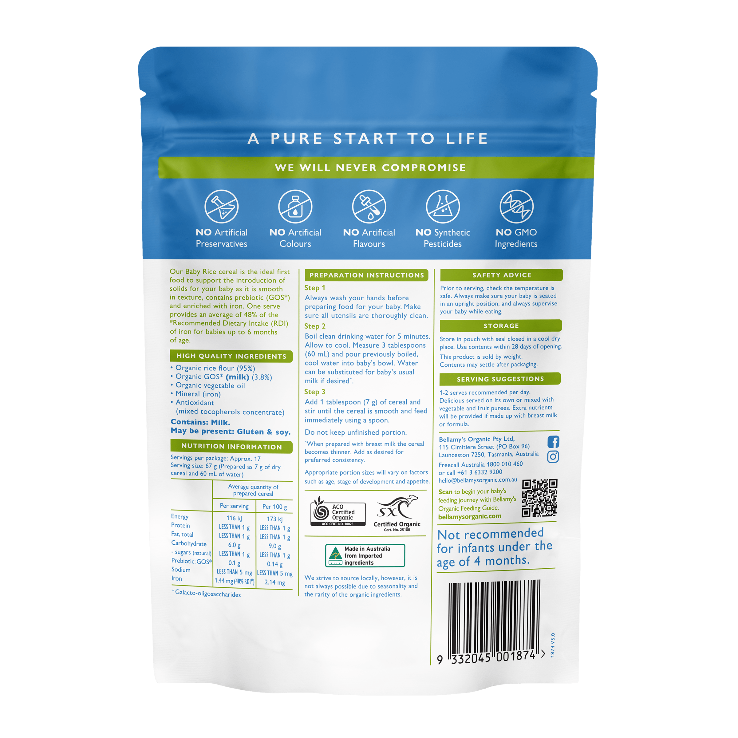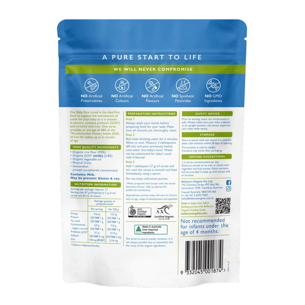 Our Organic Baby Rice cereal is the perfect first food for your baby. It’s smooth in texture, with added prebiotic GOS*, and is enriched with iron, providing 48% of your baby’s iron RDI# per serving on average. This cereal is easily made up by adding water or baby’s usual milk.