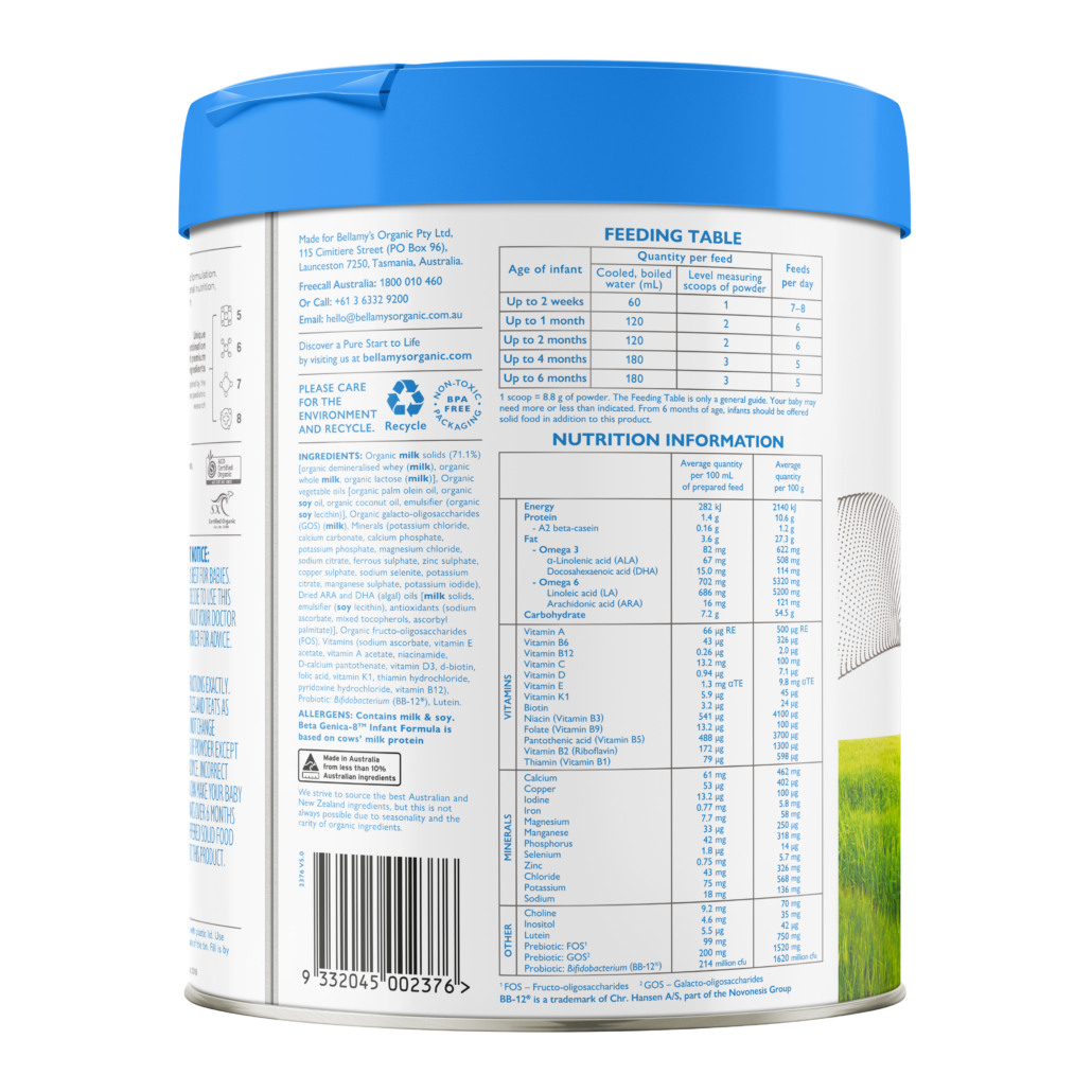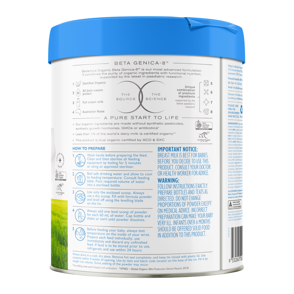 Bellamy’s Organic Beta Genica-8™ Step 1 Infant Formula is our most advanced formulation which is made from certified organic milk with A2 protein. It combines the purity of organic ingredients with functional nutrition, supported by the latest in paediatric research. Nutritionally complete, Beta Genica-8™ is formulated to meet the nutritional needs of infants from birth through to 6 months of age.