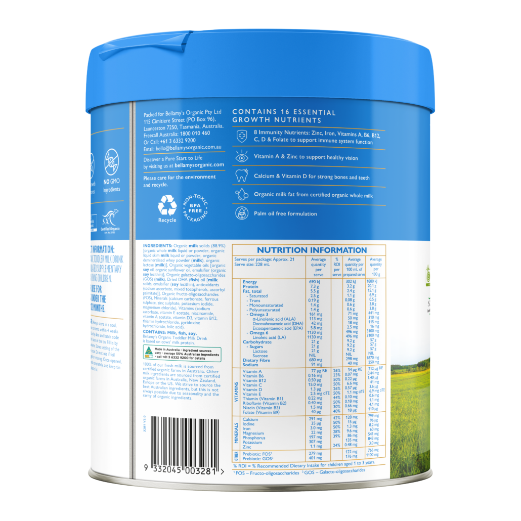 Bellamy’s Organic Step 3 Toddler Milk Drink is a premium nutrient dense milk drink, carefully crafted to support active toddlers from 1 to 3 years of age, when dietary intake may be inadequate. An enriched alternative to ordinary cow’s milk, our Toddler Milk Drink is made with certified organic full cream cow’s milk and is fortified with essential vitamins and minerals to support the needs of your growing toddler.