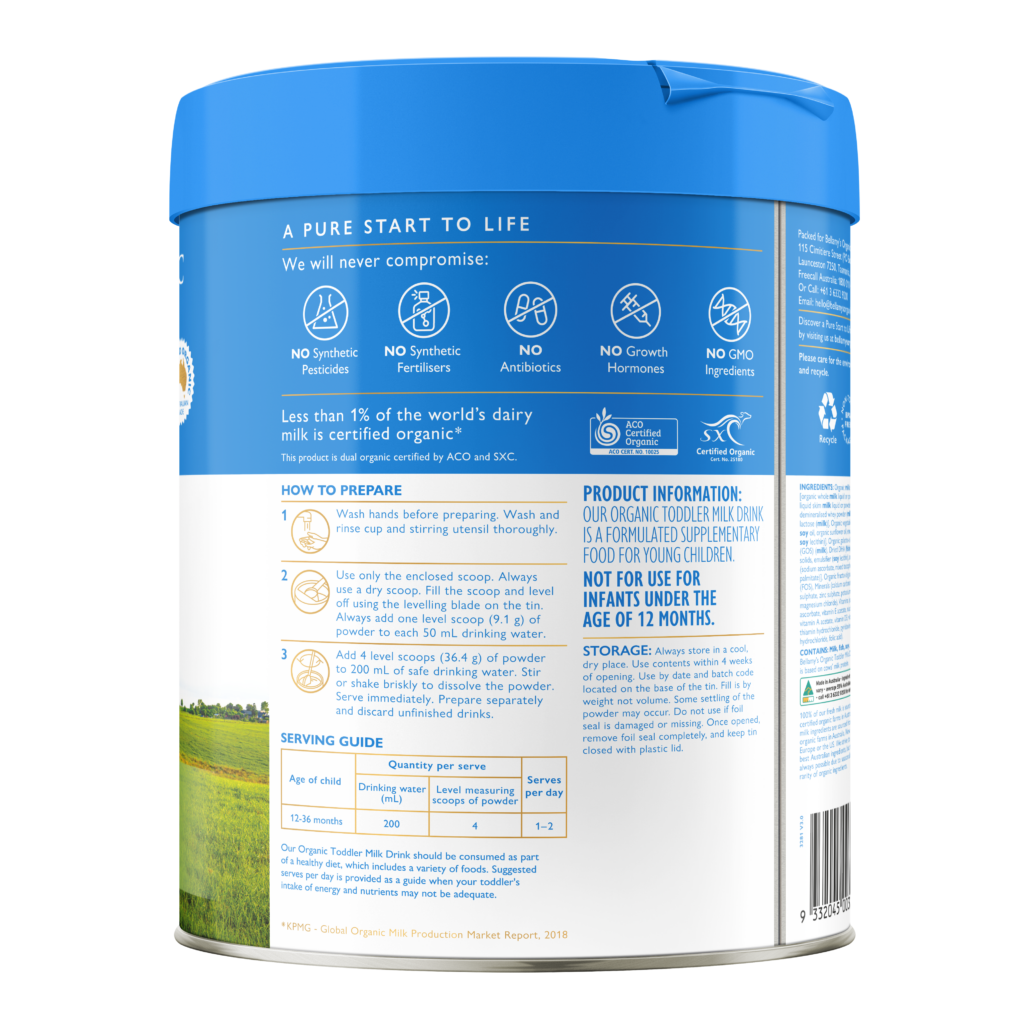 Our Organic Toddler Milk Drink should be consumed as part of a healthy diet, which includes a variety of foods. Suggested serves per day is provided as a guide when your toddler’s intake of energy and nutrients may not be adequate.