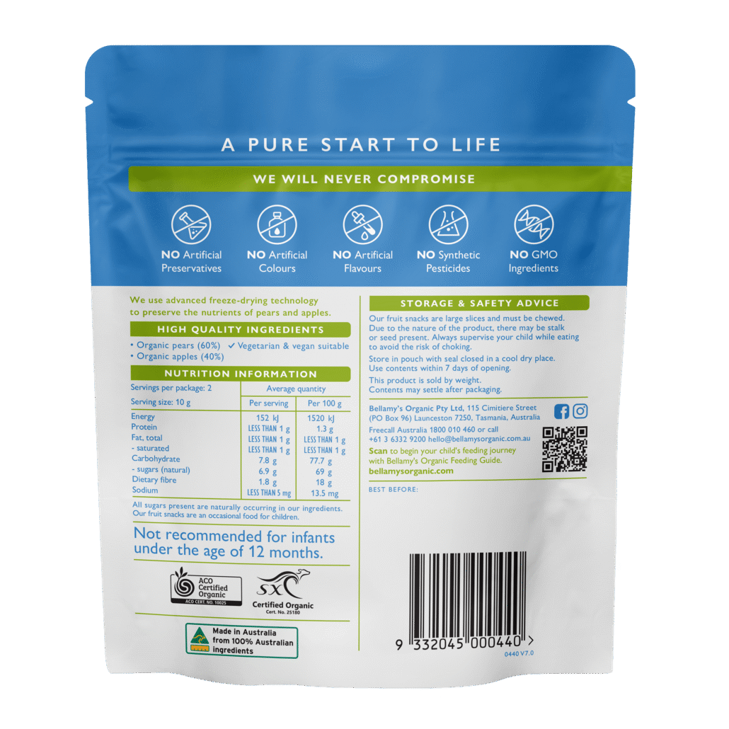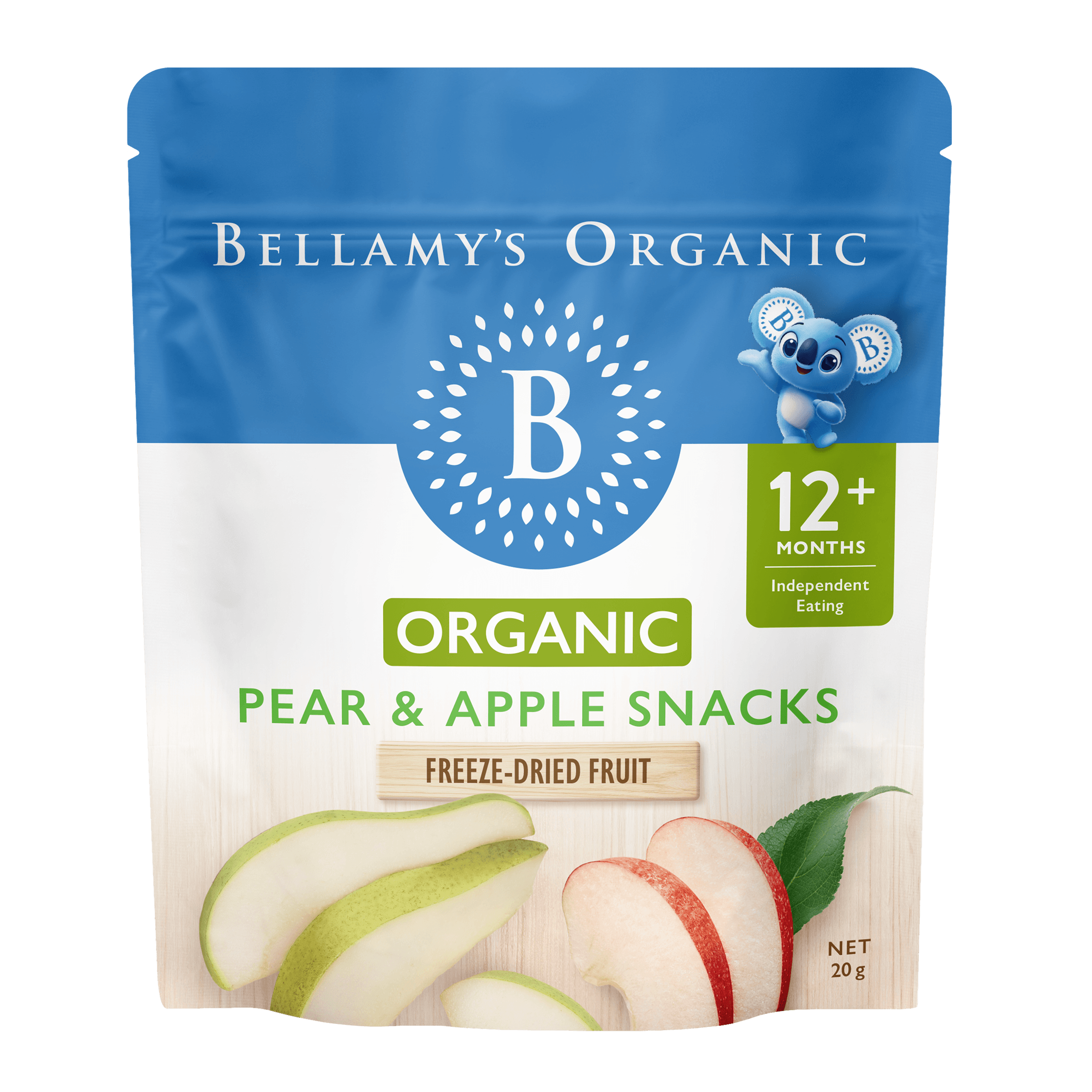 100% certified organic pear and apple snap-dried for a crisp crunch. A wholesome and convenient between-meals snack in a resealable pouch, perfect for on-the-go.