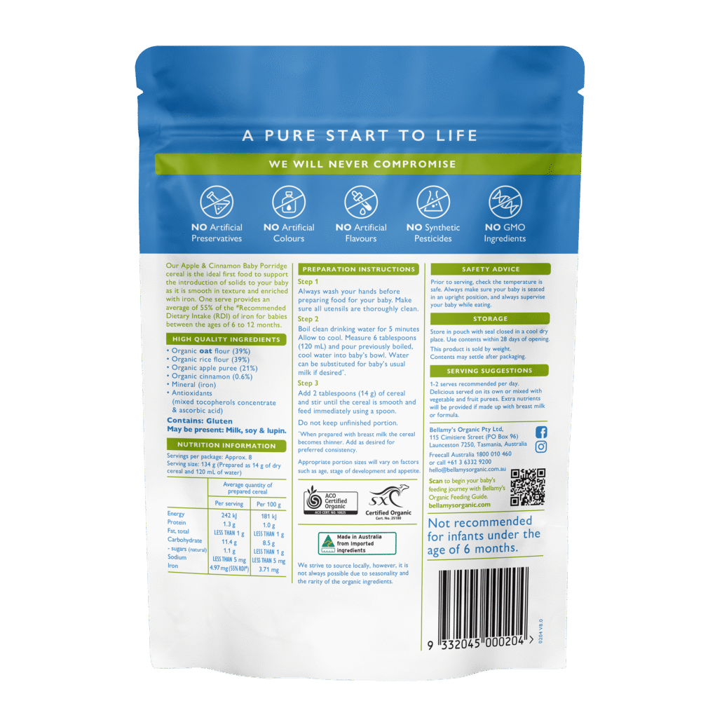 Our Organic Apple and Cinnamon Porridge is a nutritious blend of organic oat and rice flour with organic apple puree and cinnamon. This cereal is easily made up by adding water or baby’s usual milk.