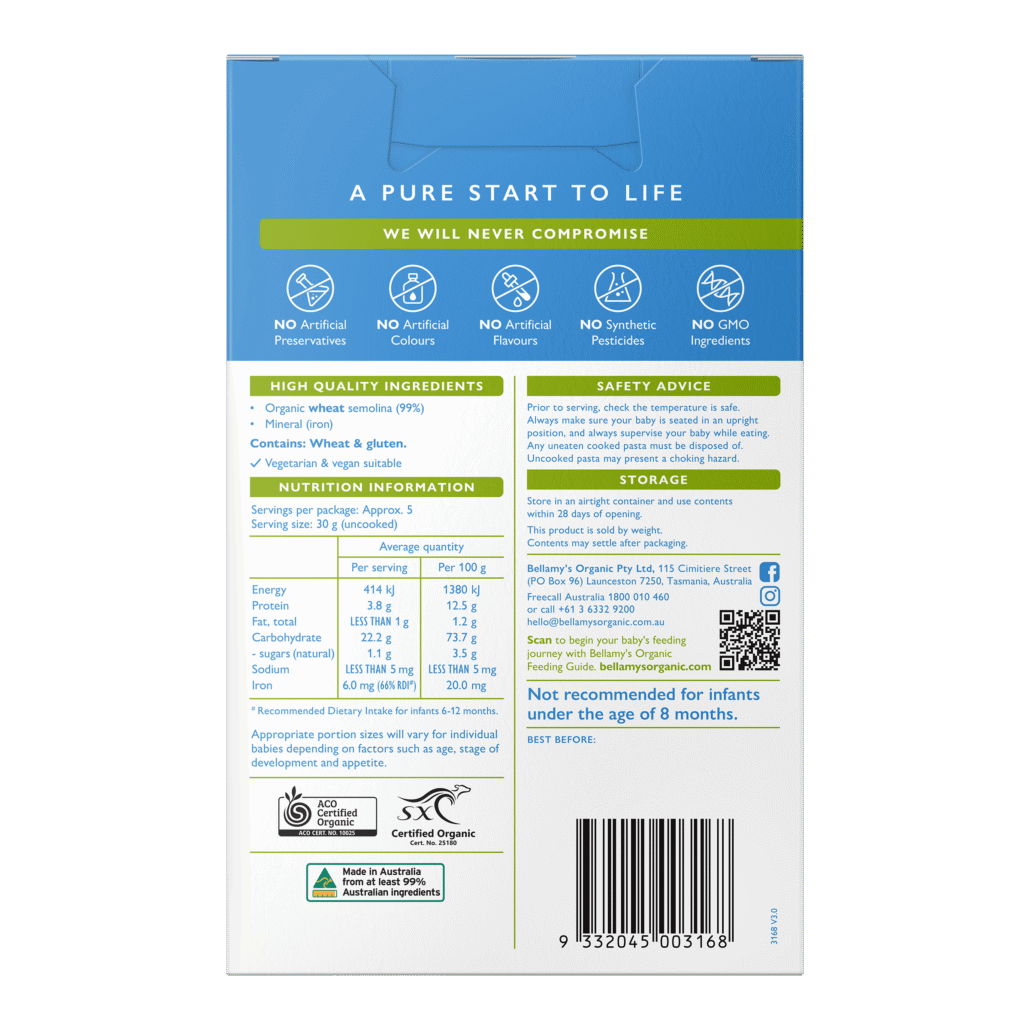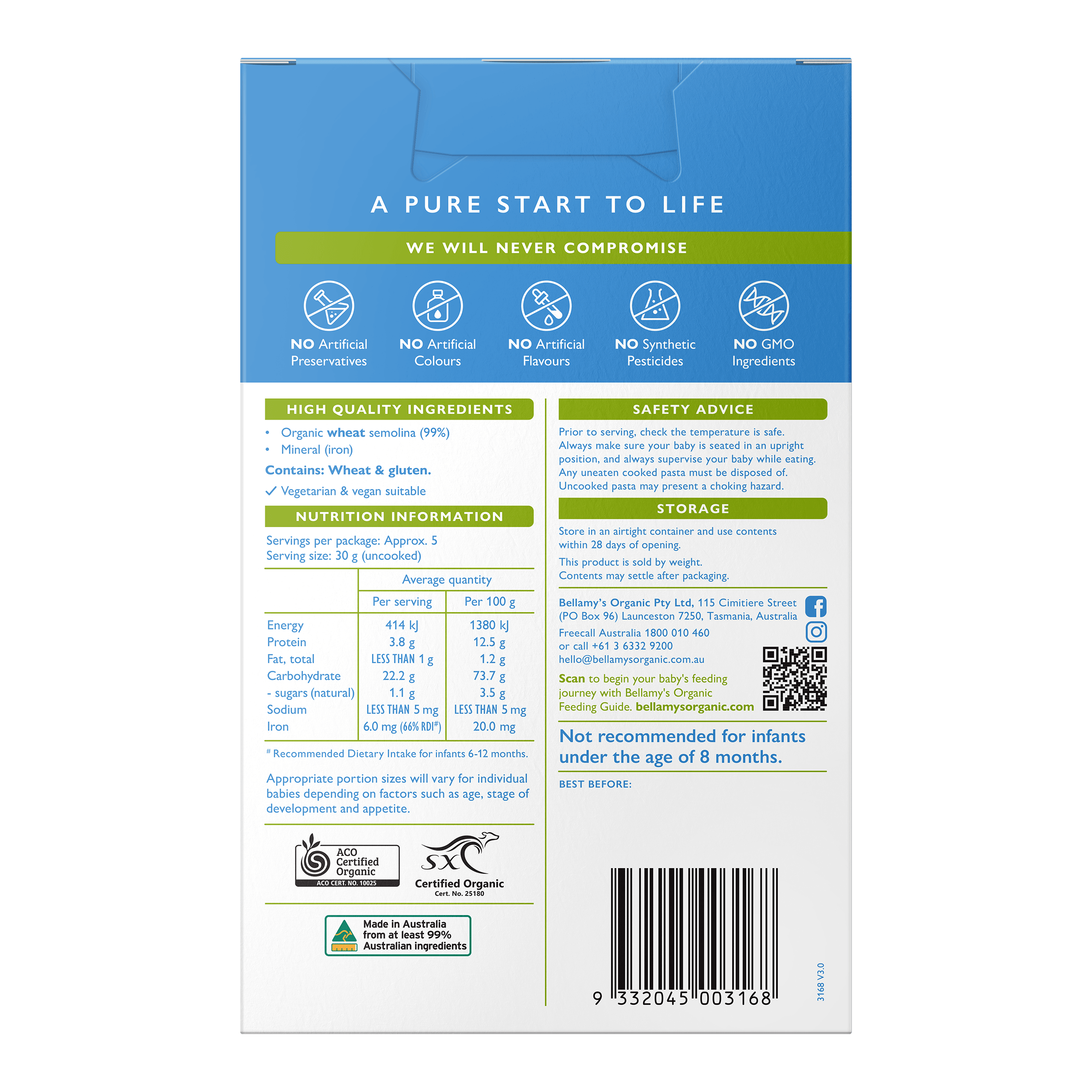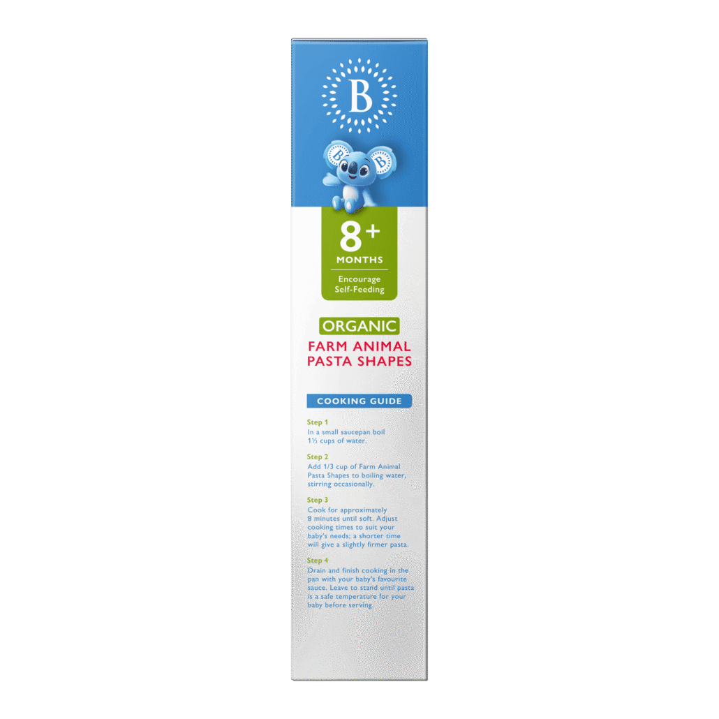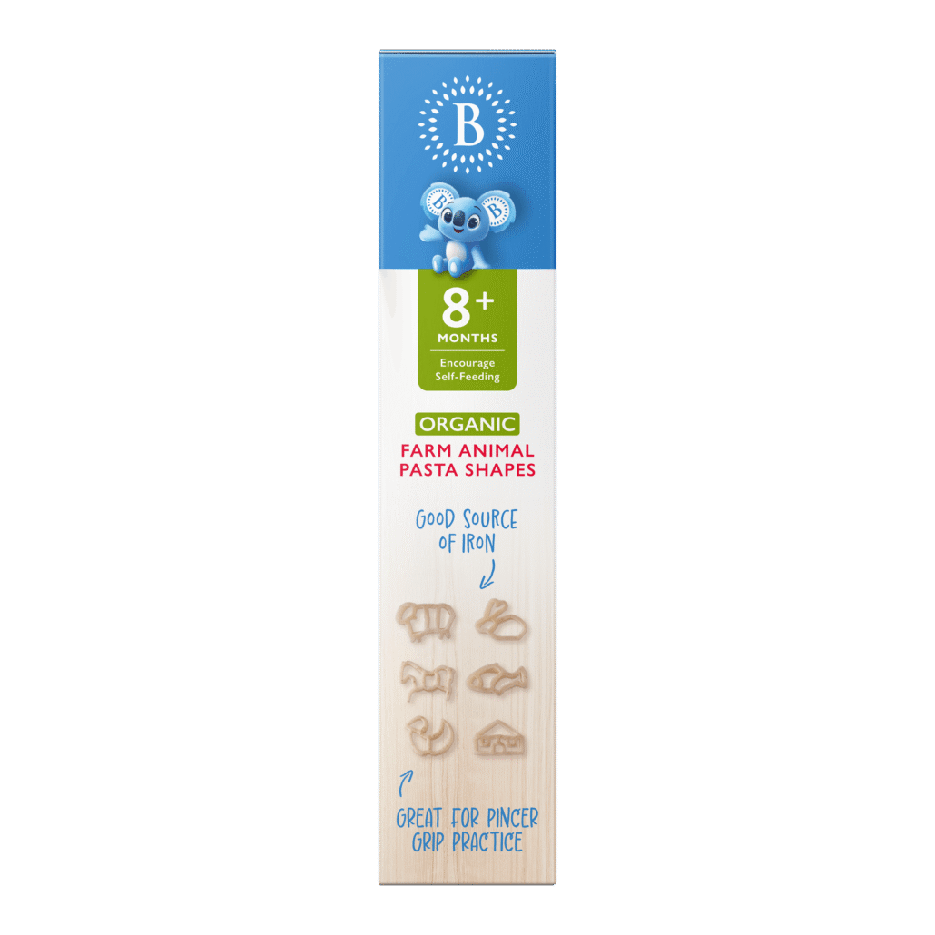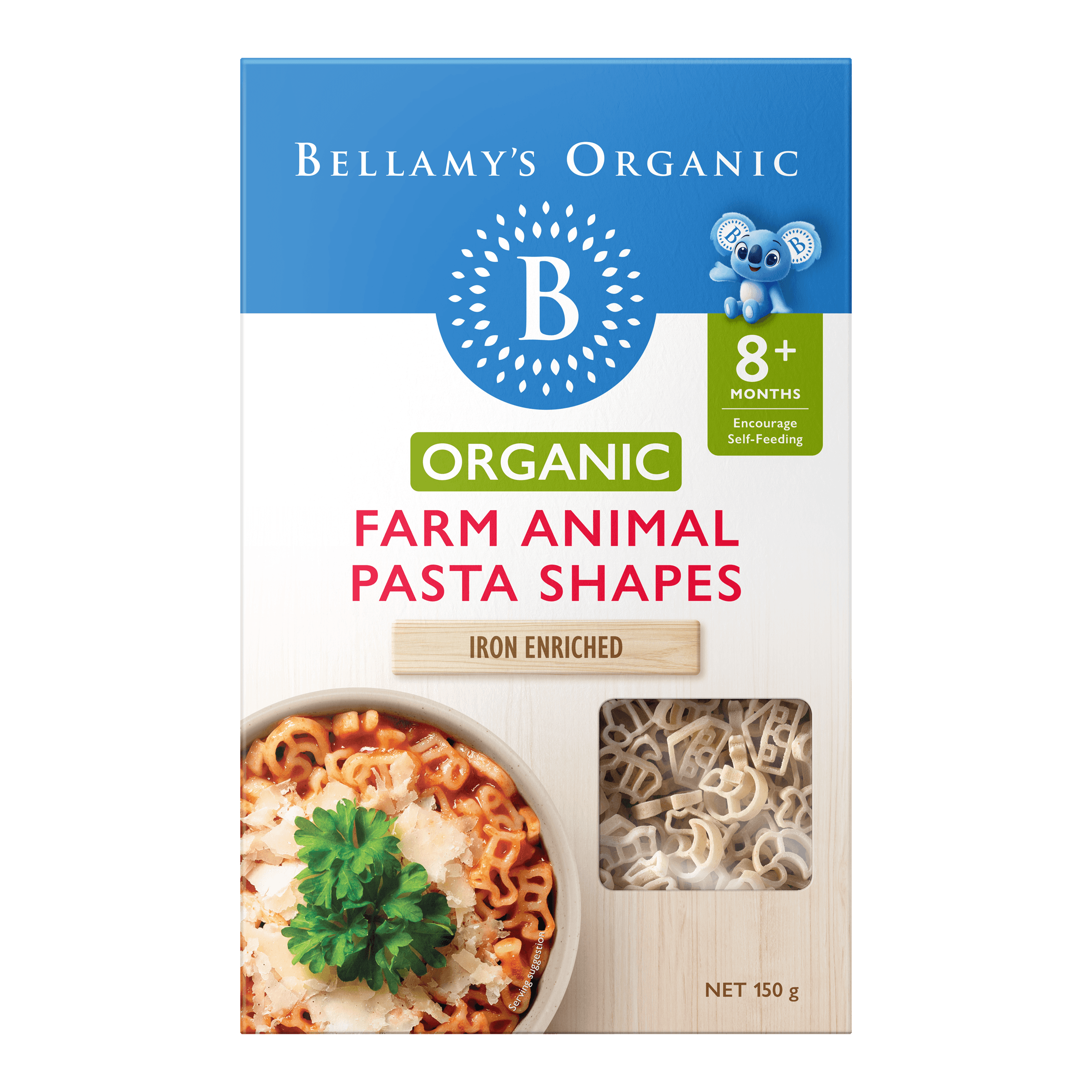 Bellamy’s Organic Farm Animal Pasta Shapes are a great way to encourage self-feeding from 8 months of age. Enriched with iron to support your baby’s growing nutritional needs and great for pincer grip practice. Easy for little hands to discover fun shapes like sheep, rabbit, horse, duck and their farmhouse.