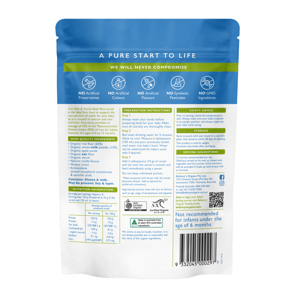 Our Organic Milk & Vanilla Baby Rice cereal is the ideal way to introduce solids to your baby. Smooth in texture and enriched with iron so that on average one serve contributes to 55% of your baby’s iron RDI* needs. This cereal is easily made up by adding water or baby’s usual milk.