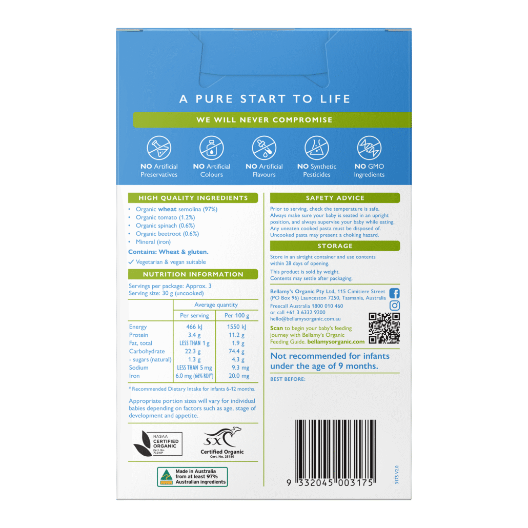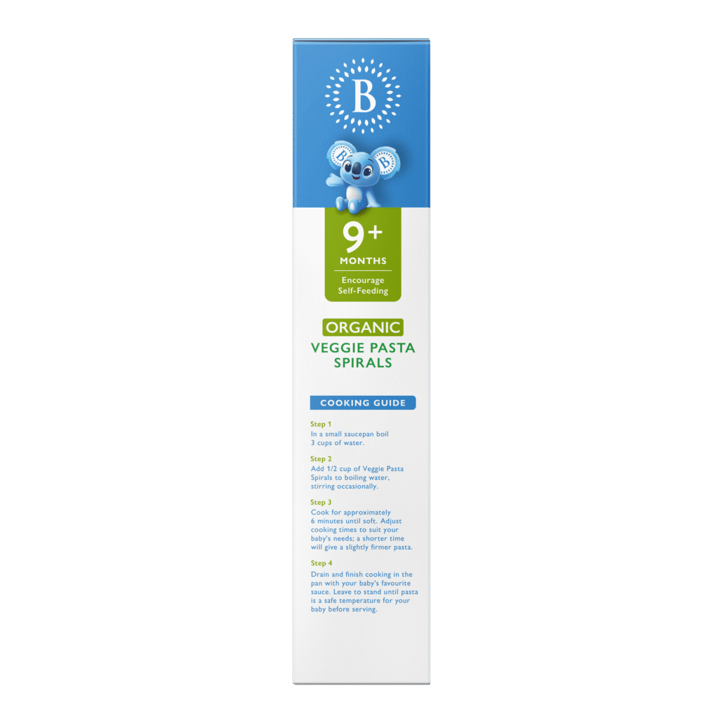 Bellamy’s Organic Veggie Pasta Spirals make it fun to introduce colour to your baby’s diet. With added iron, they support your growing baby’s nutritional needs and are a great shape for holding to encourage self-feeding . These bright pasta spirals add fun to the mealtime for your little one and can be enjoyed on their own or added to a sauce.